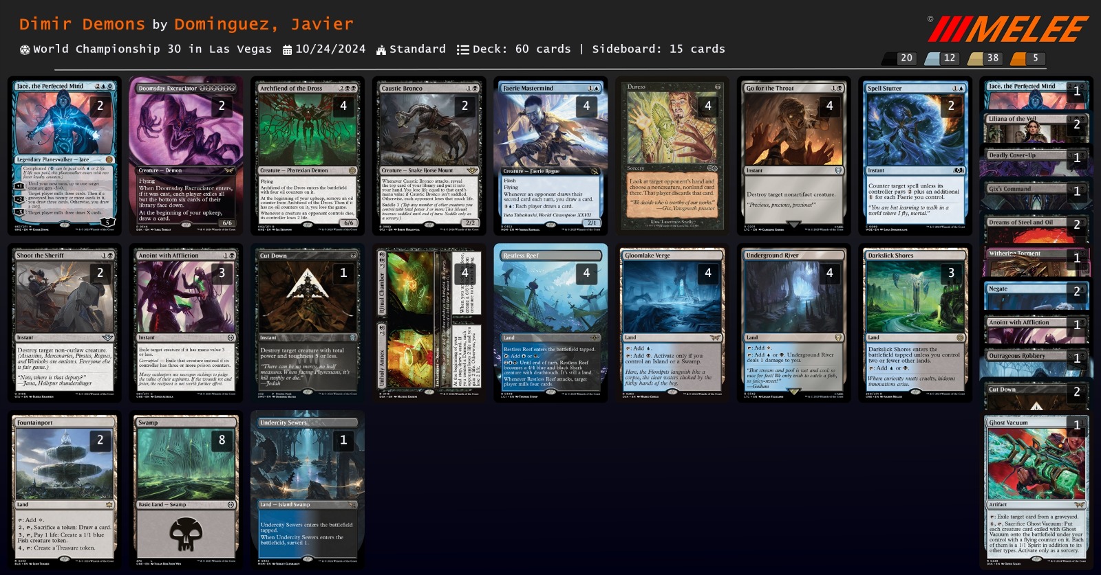 El meta juego del mundial vino a confirmar como el mazo más elegido a Gruul Prowess, pero también pudimos ver como Mono-White Tokens prácticamente desapareció y hubo un ascenso de Dimir Midrange y UB Demons, que fue el mazo que eligieron entre otros tres de los jugadores españoles: Javier Domínguez "Thalai" Toni Ramis y Adrián Iñigo.