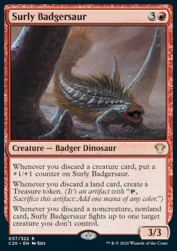 Destaca su combinación con el último comandante llegado desde Edge of Eternities: Szarel, Genesis Shepherd, con el cuál vamos a poder jugar las tierras desde el cementerio, así que con Surly Badgersaur vamos a poder descartar las tierras para poder jugarlas con este futuro comandante y ganando tesoros por el camino.