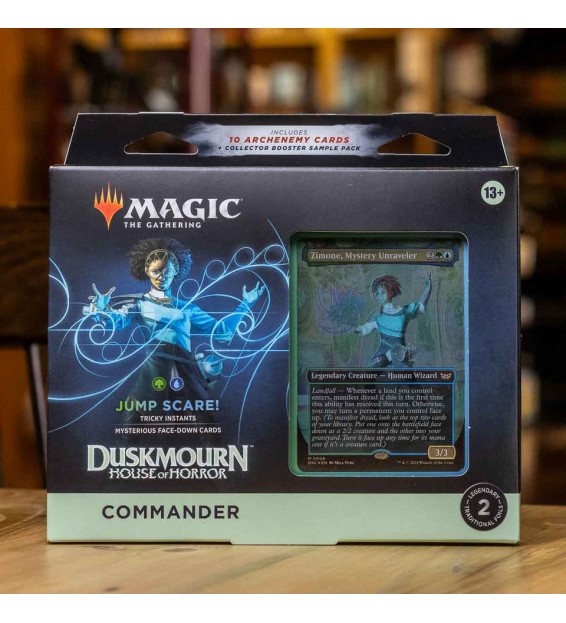 Los mazos de Commander de Duskmourn: House of Horror contienen 100 cartas y están listos para jugar (2 cartas legendarias foil tradicionales y 98 cartas no foil), 8 cartas nuevas en Commander, 10 cartas de Archenemy nuevas, 10 fichas de dos caras, 1 caja guardamazo, 1 hoja de estrategia y 1 tarjeta de referencia. Ahora, cada Mazo de Commander viene con 1 Sobre de Coleccionista especial con 2 cartas de muestra.