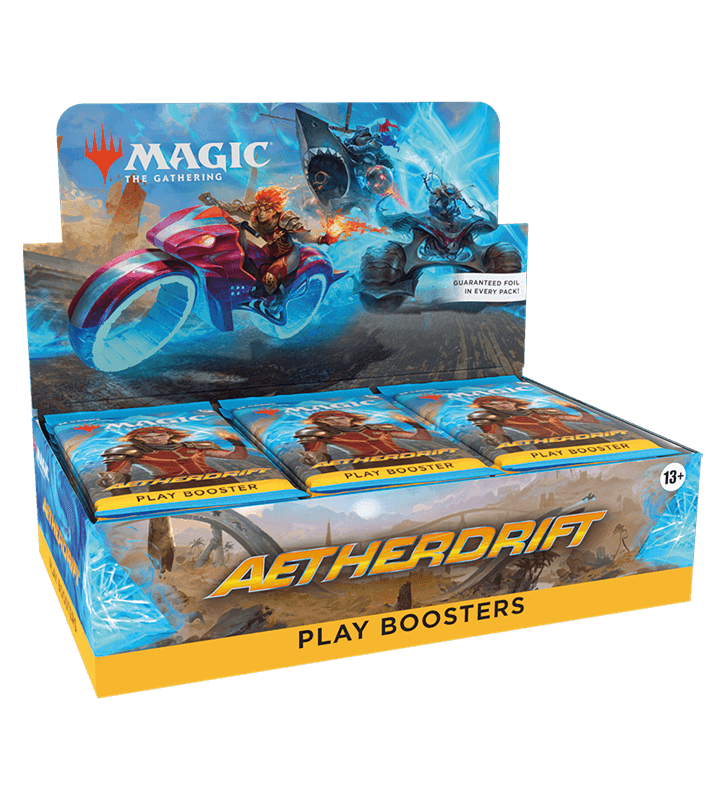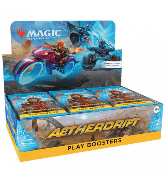 Cada Caja de Sobres de Juego de Aetherdrift contiene 30 Sobres de Juego y 1 Sobre Box Topper. Cada Sobre de Juego contiene 14 cartas. Cada sobre incluye una combinación de entre 1 y 4 cartas raras o de una rareza superior, entre 3 y 5 poco comunes, entre 6 y 9 comunes y 1 carta de tierra. 1 carta de cualquier rareza es foil tradicional. Hay una carta rara mítica de Gigantes del grafiti foil sin borde en menos del 1% de los sobres. Una tierra foil tradicional sustituye a una tierra en el 20% de los sobres.