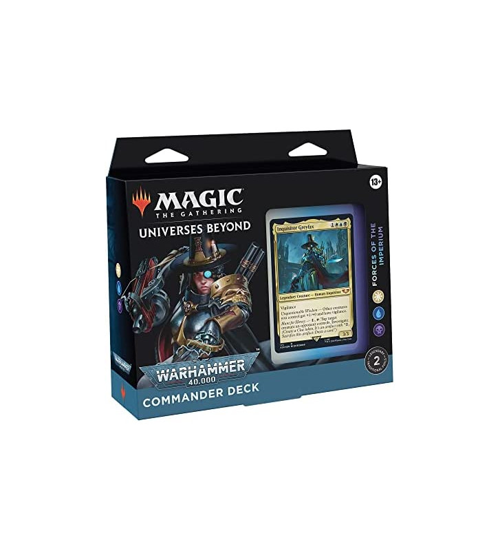 Warhammer 40,000 Mazo de Commander de 100 cartas listo para jugar: Fuerzas del Imperium Mazo blanco-azul-negro: contiene 2 cartas legendarias foil tradicionales y 98 no foil Todas las cartas tienen ilustraciones inspiradas en Warhammer y hay 42 cartas de Magic nuevas 1 comandante foil grabado especial 10 fichas de dos caras, 1 contador de vidas y caja guardamazo